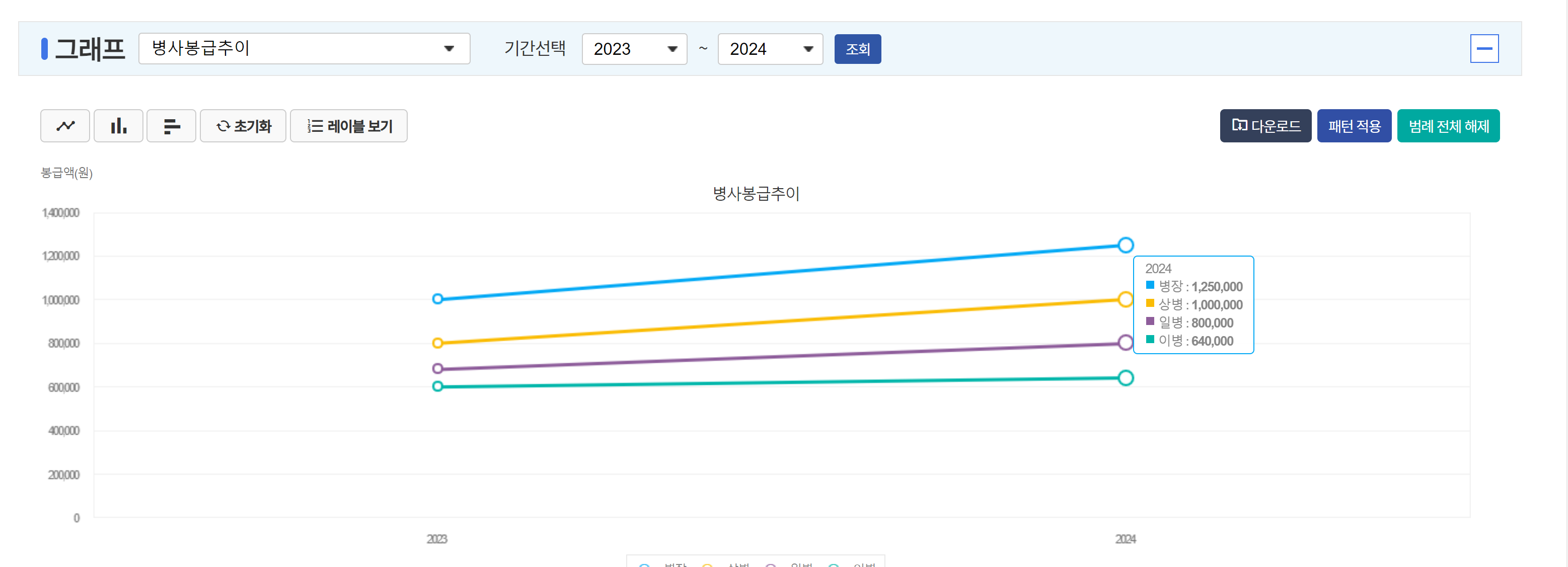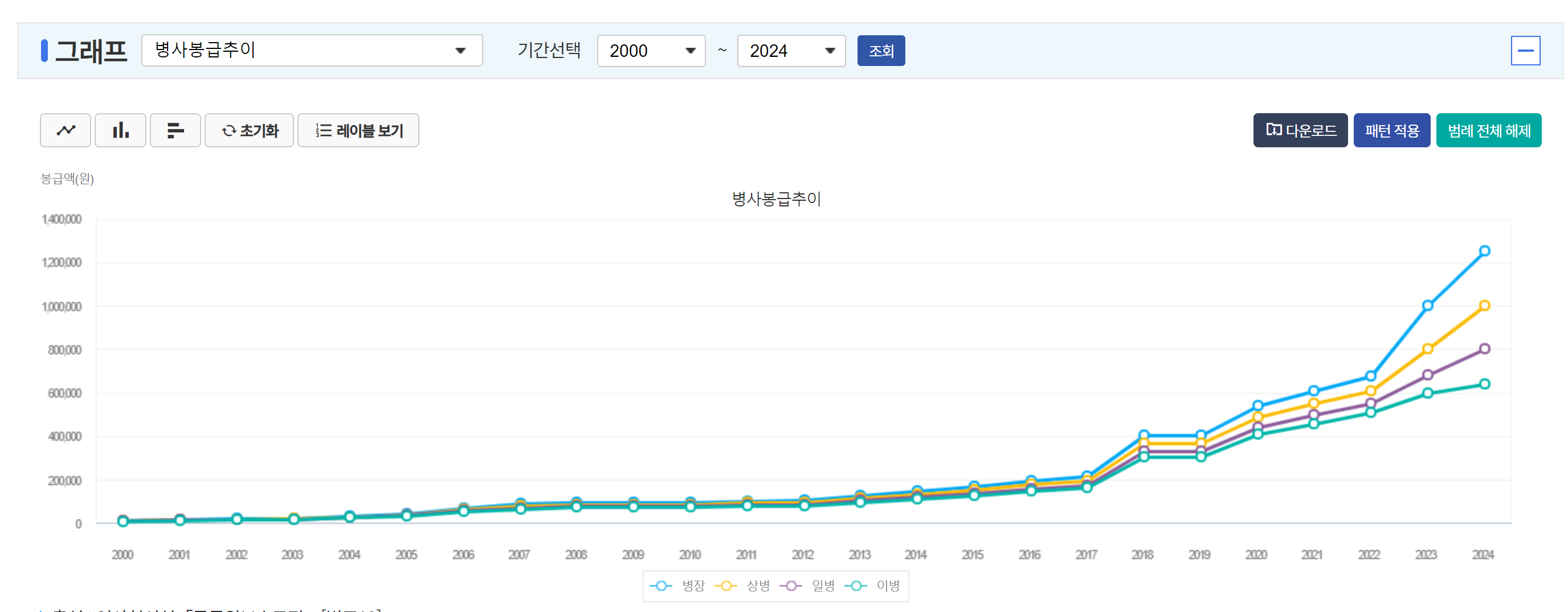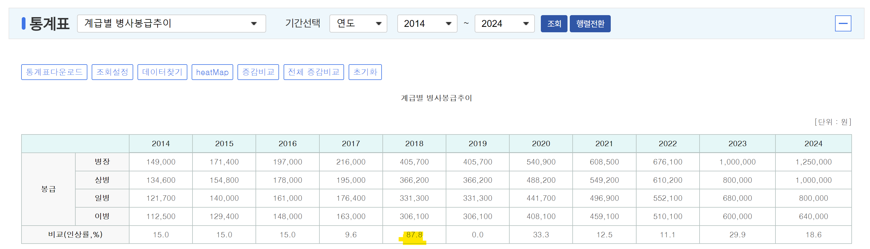 오늘은 계급별 병사 봉급 추이가 어떻게 변화 되었는지