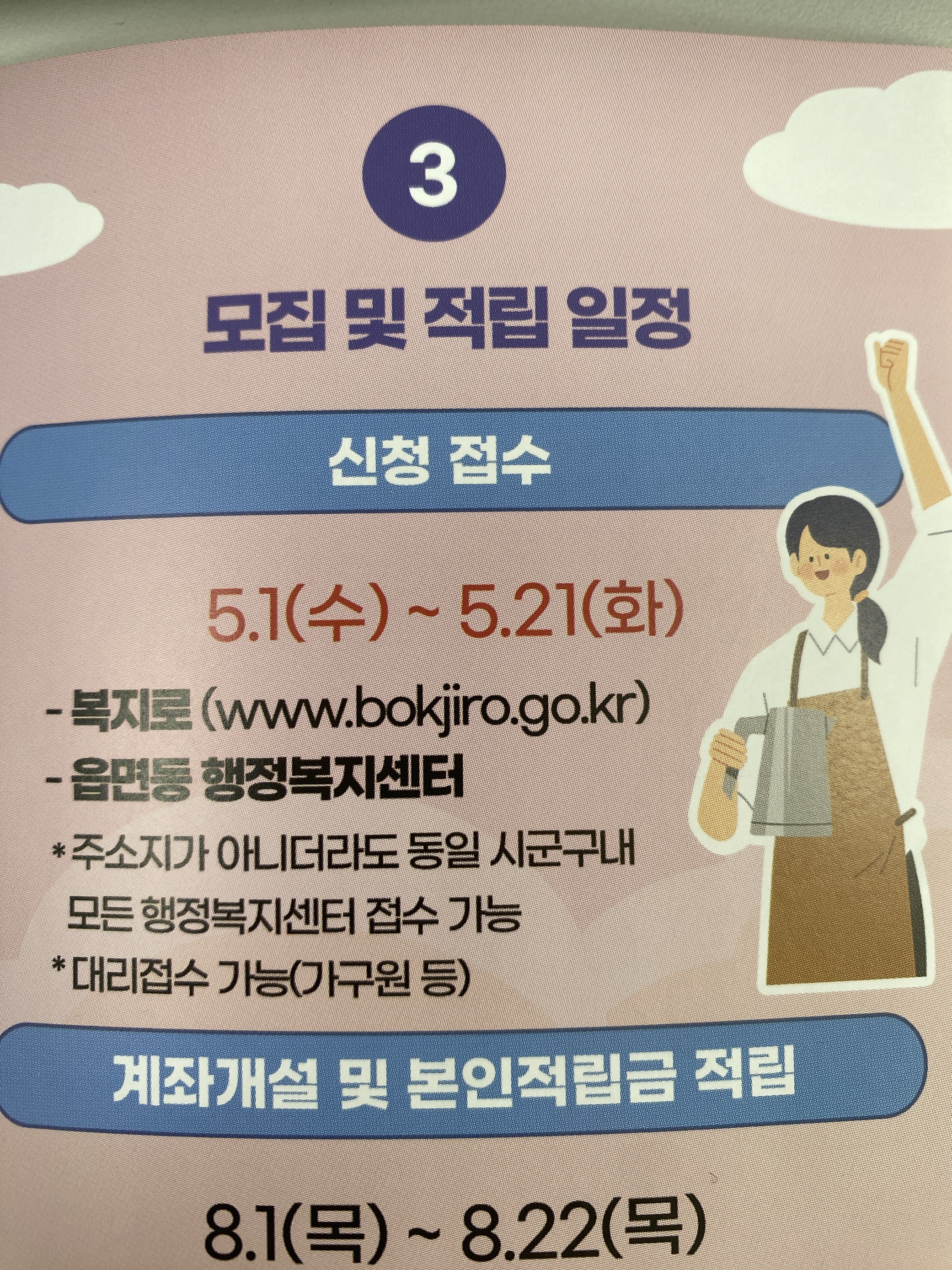 - 온라인 신청 : 복지로 홈페이지나 자산형성포털 사이트를 통해 온라인으로 신청 가능.