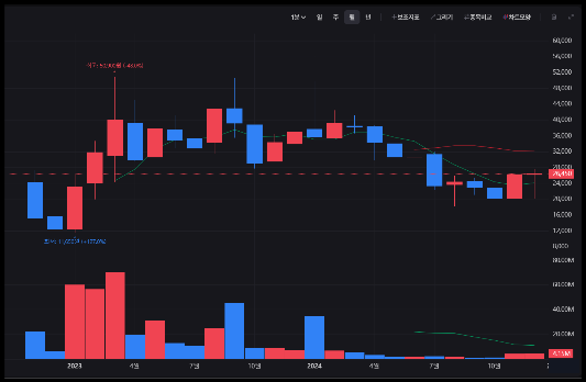 월봉 차트를 보면 2021년 고점 이후 하락세를 보였으나,