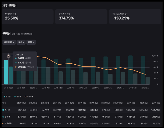 현금성자산도 풍부해 재무 안정성이 높은 편입니다.