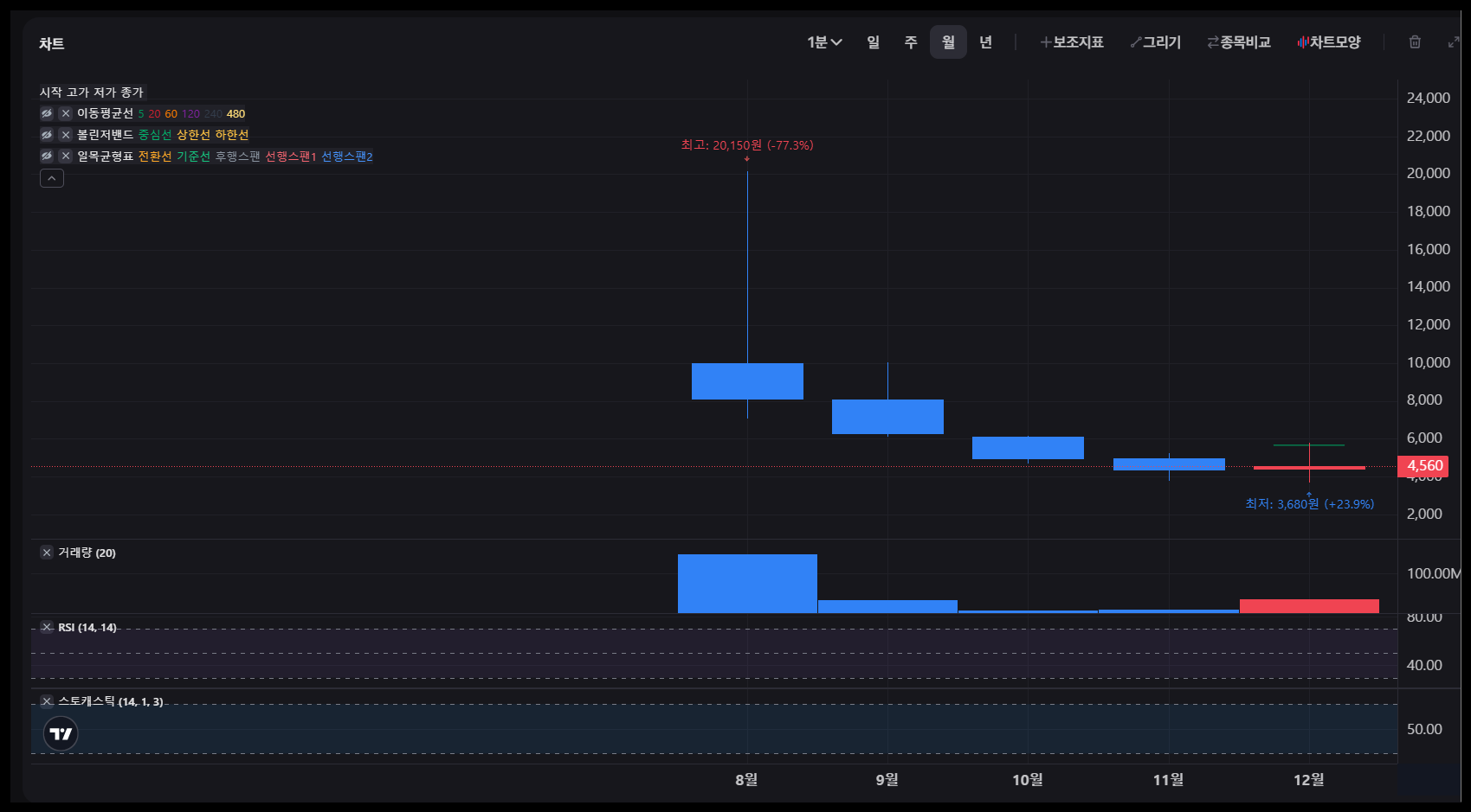 월봉 차트를 보면 상장 이후 하락세를 보였으나,