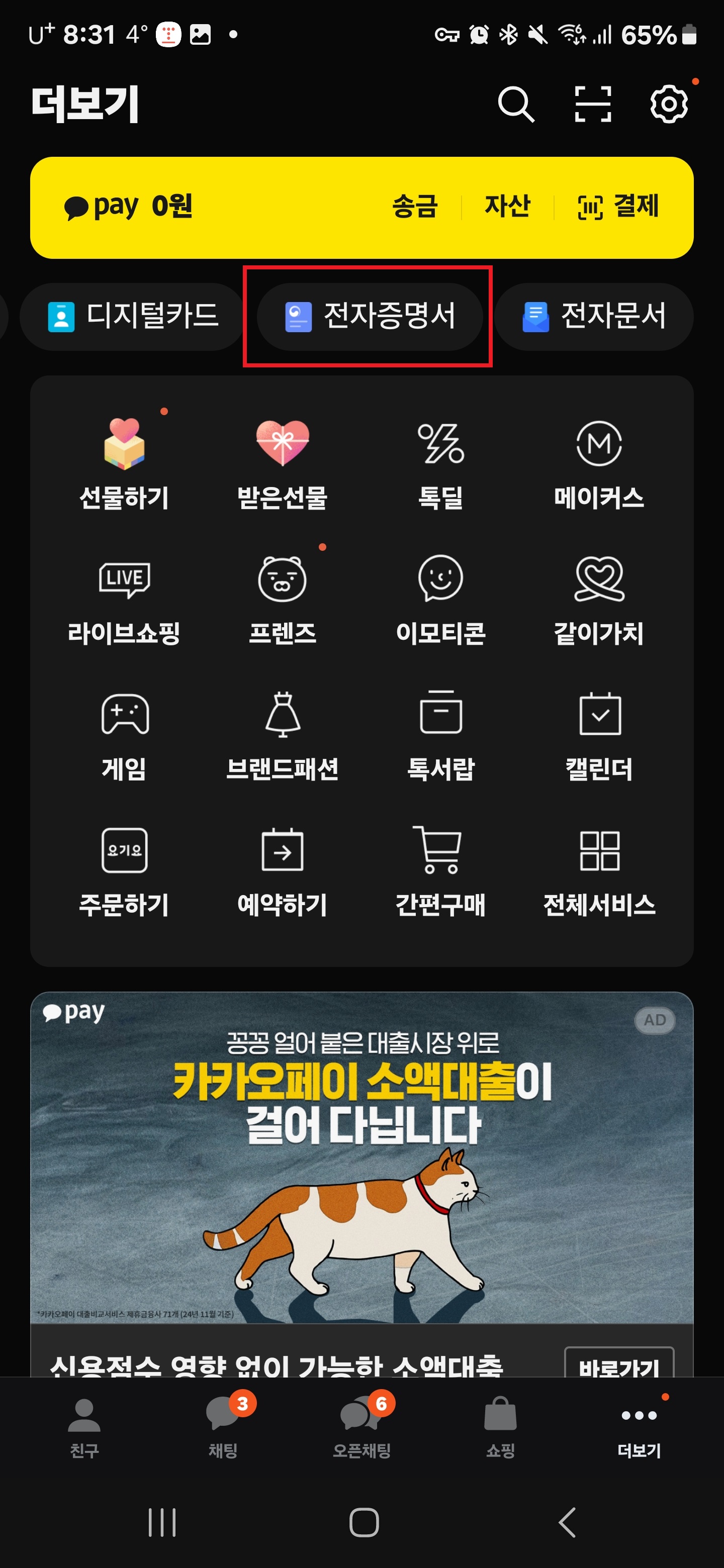 2.하단에 더보기 선택, 상단에 전자증명서 선택