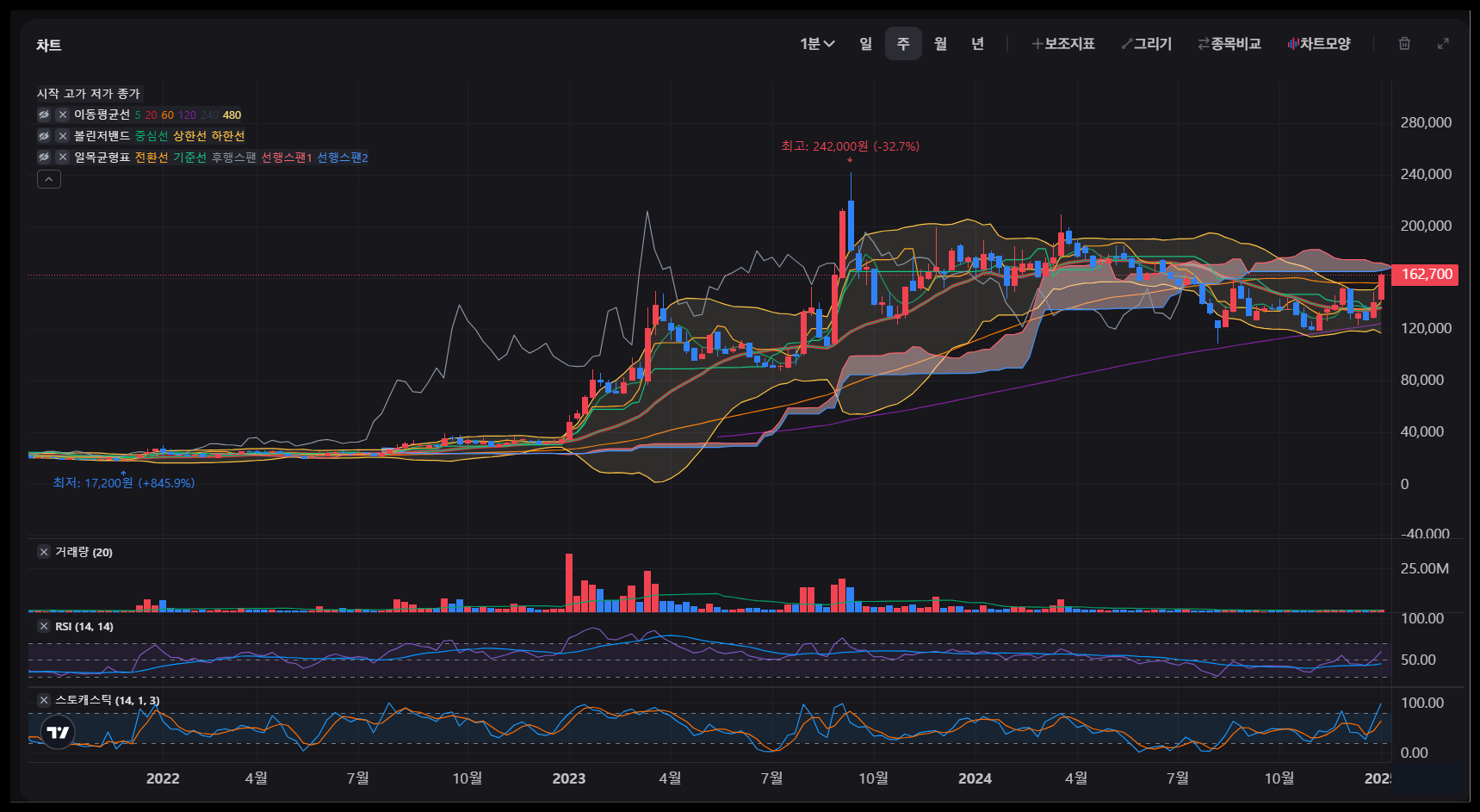 일봉 차트를 살펴보면, 레인보우로보틱스의 주가는