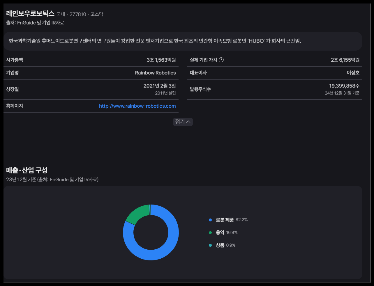 레인보우로보틱스를 자회사로 편입시켰습니다.