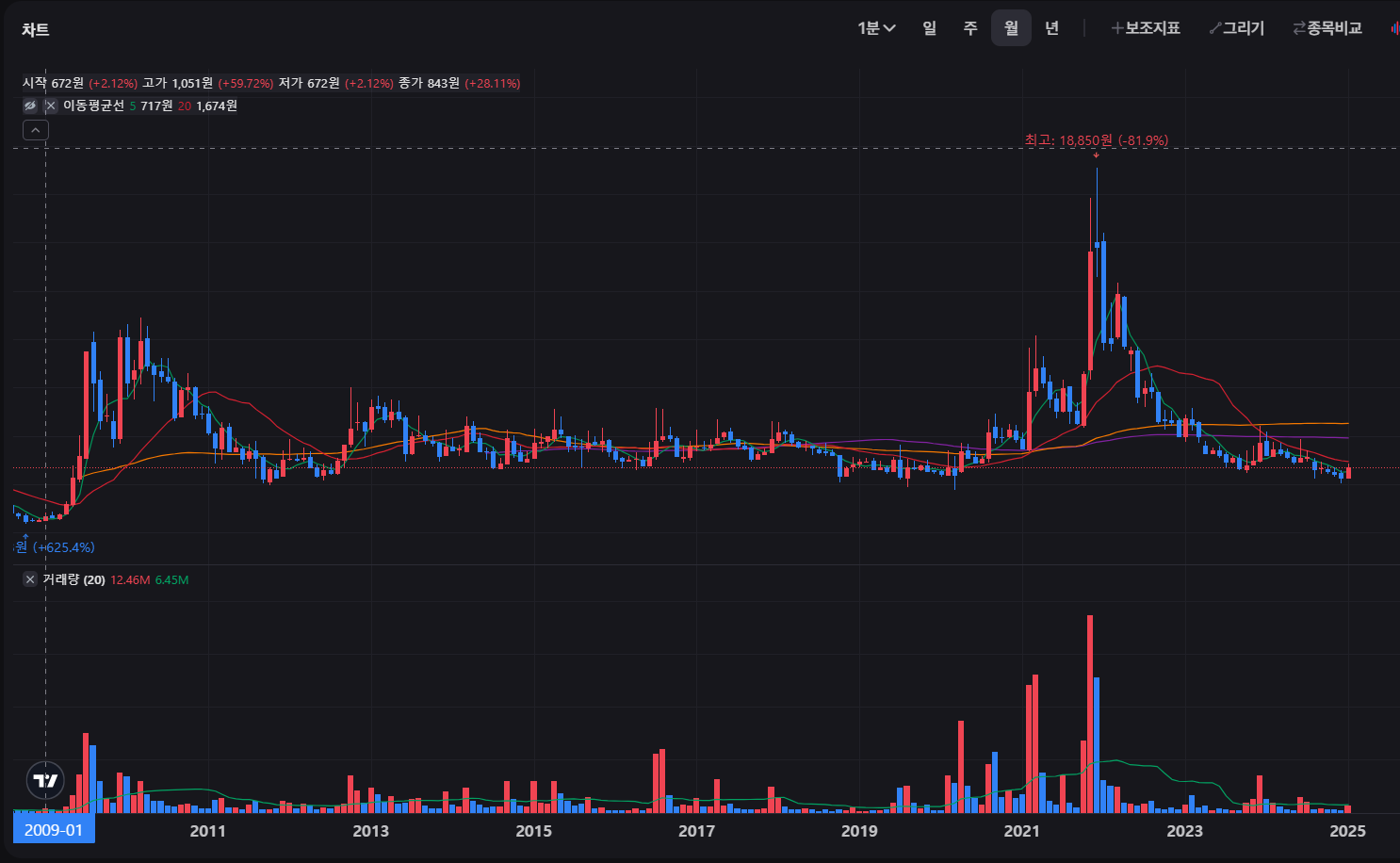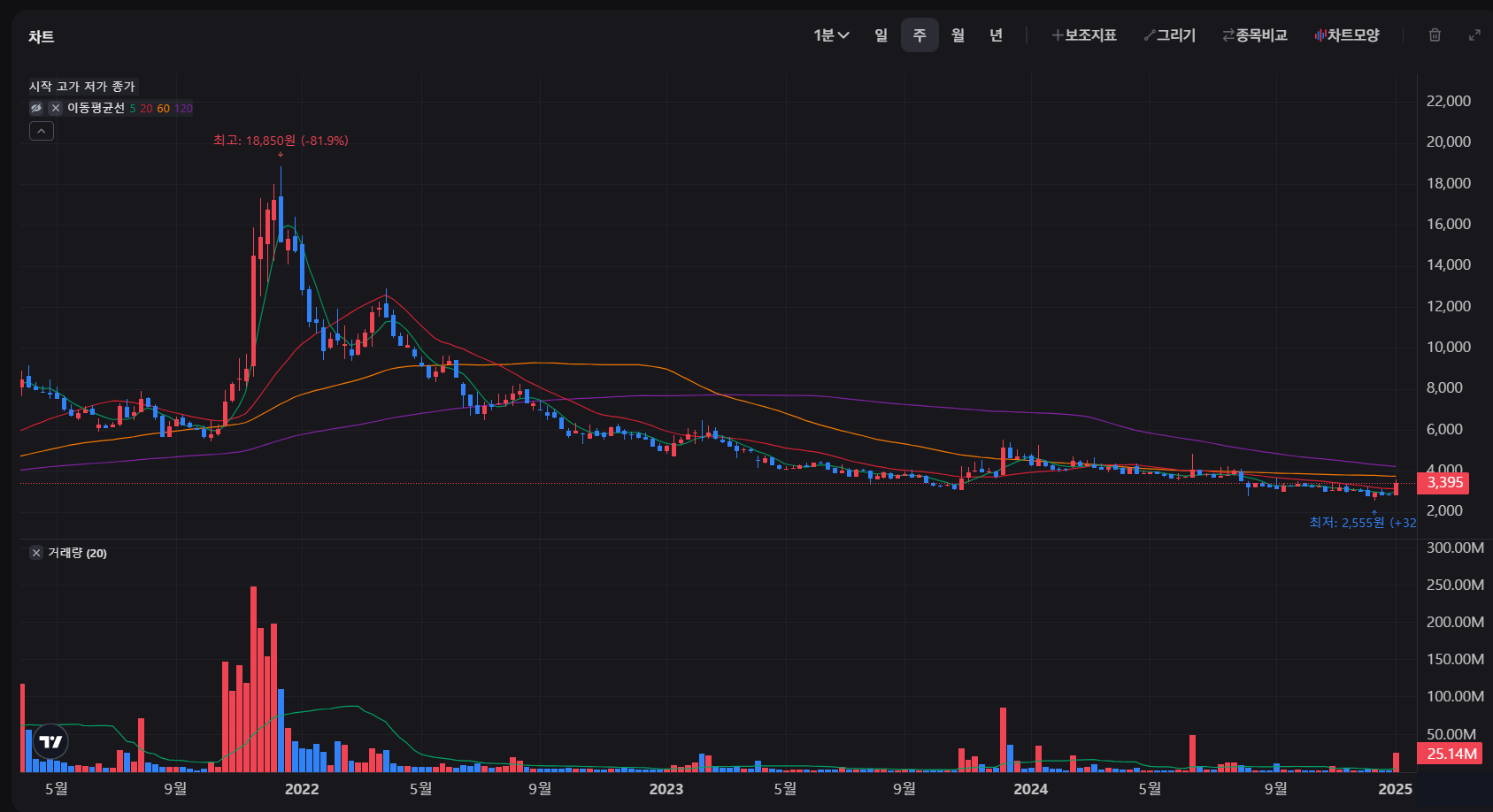 월봉 차트를 보면, 2021년 고점 이후 하락세를 보였으나