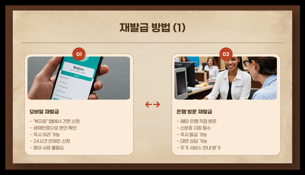 모바일 재발급: '복지로' 앱에서 생체인증만 하면 즉시 재발급 가능!