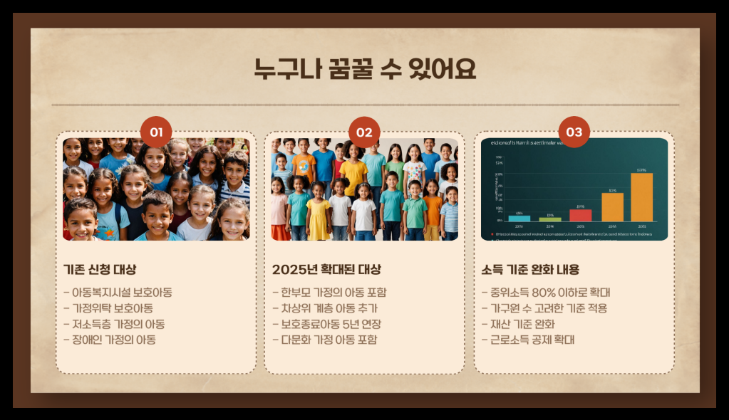 그리고 또 하나 좋은 소식! 올해부터 소득 기준이 완화되어 중위소득 80% 이하 가정의 아동까지 신청 가능하게 되었어요. 덕분에 더 많은 아이들이 자립을 위한 기회를 잡을 수 있게 되었죠. 😊