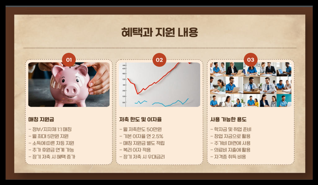 이게 왜 중요하냐고요? 이 통장을 통해 아동이 저축한 금액만큼 정부가 1:1로 매칭해 지원해 주거든요. 즉, 아이가 10만 원을 저축하면 정부가 추가로 10만 원을 넣어줘서 총 20만 원이 되는 방식이에요. 미래를 준비하는 데 엄청난 도움이 되겠죠? 😊