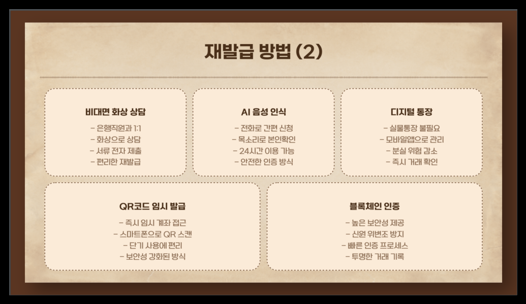 비대면 화상 상담: 은행 직원과 화상 통화를 통해 재발급 받을 수 있어요.