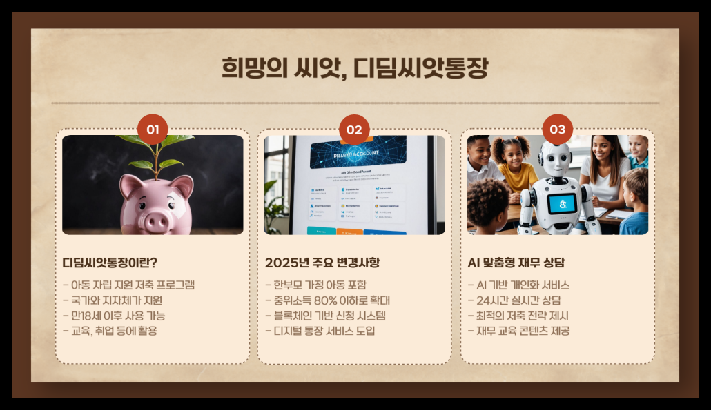 간단히 말하면, 디딤씨앗통장은 아동복지시설 보호아동, 가정위탁 보호아동, 저소득층 아동들의 자립을 돕기 위한 정부 지원 저축 프로그램이에요. 2025년에는 한부모 가정의 아동까지 지원 대상이 확대되면서 더 많은 아이들이 혜택을 받을 수 있게 되었어요! 🎉