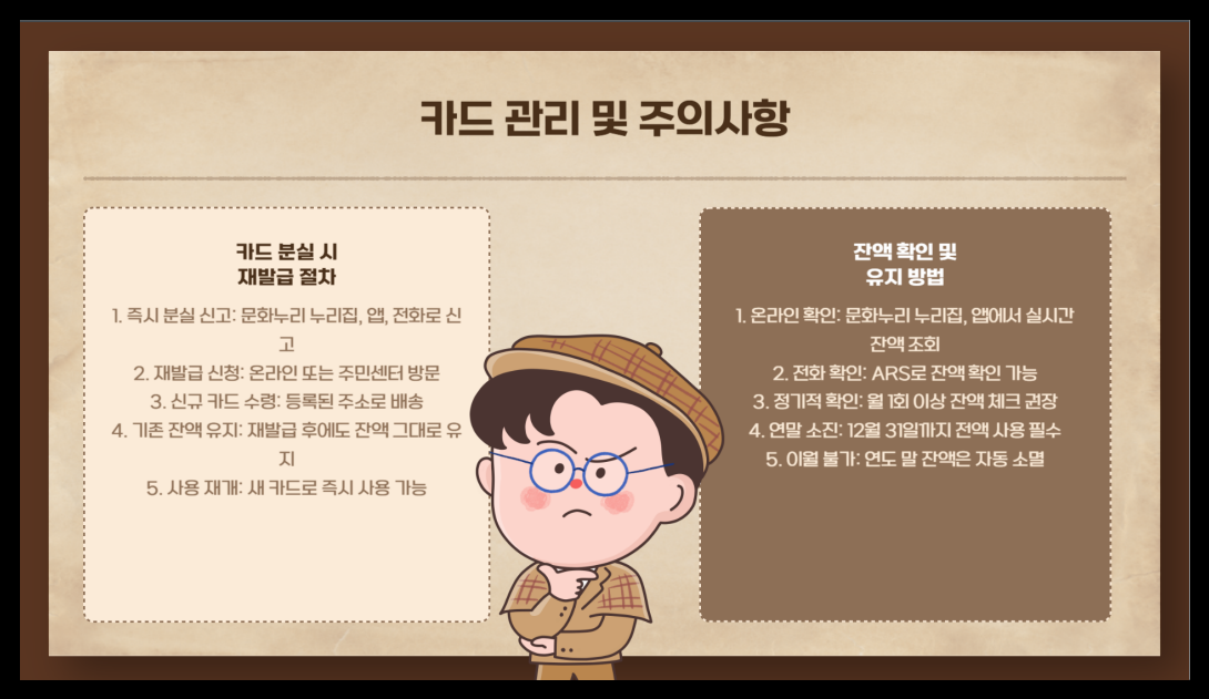 혹시 카드를 잃어버려도 당황할 필요 없어요. 🆕 재발급이 아주 간단하거든요. 🖥️ 문화누리 누리집이나 📱 모바일 앱에서 온라인으로 신청할 수 있고, 가까운 주민센터에서도 신청할 수 있어요. 💳 게다가 재발급받아도 기존에 충전된 금액은 그대로 유지되니 걱정하지 않으셔도 돼요!