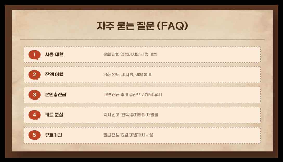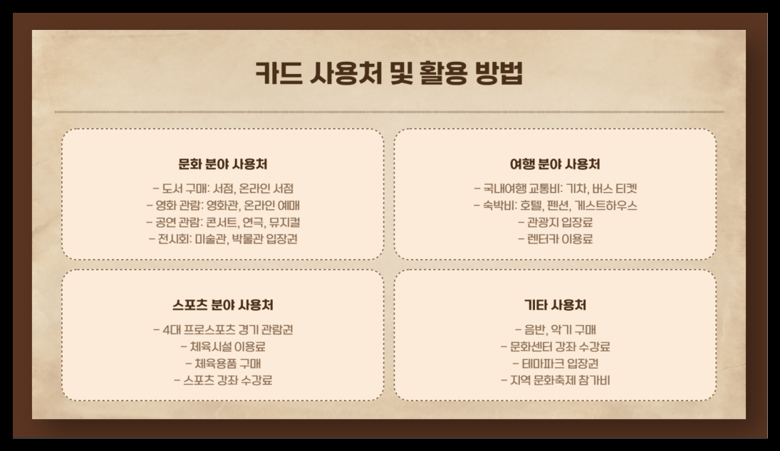 이 카드를 어디에서 사용할 수 있을까요? 정말 다양한 곳에서 활용할 수 있어요! 📚 책을 사거나, 🎬 영화관에서 최신 영화를 보는 건 기본이고요. 🖼️ 미술관이나 박물관 전시 관람, 국내여행 시 🚆 교통비와 🏨 숙박비 결제까지 가능해요. 게다가 ⚽ 스포츠 경기 관람이나 🏋️ 체육용품 구입도 가능하니 활용도가 정말 높죠!